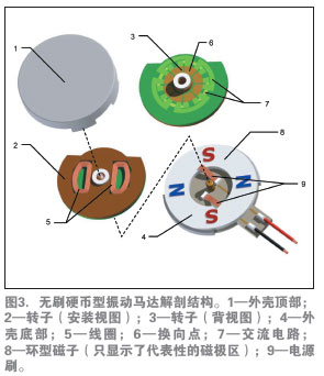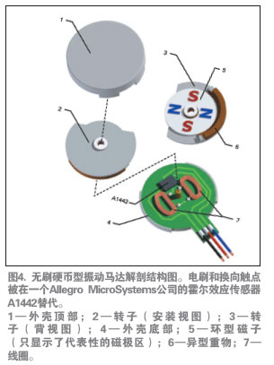 如前所述,無刷電機具有較長的壽命,并由于產生的電火花較少,也沒有了RFI干擾。無刷直流(BLDC)設計還提供業內直徑最小、厚度最薄的扁平振動馬達。圖4介紹了這種馬達的基本構造。