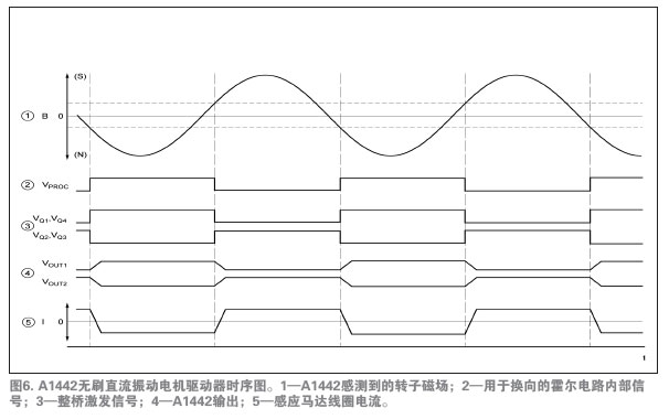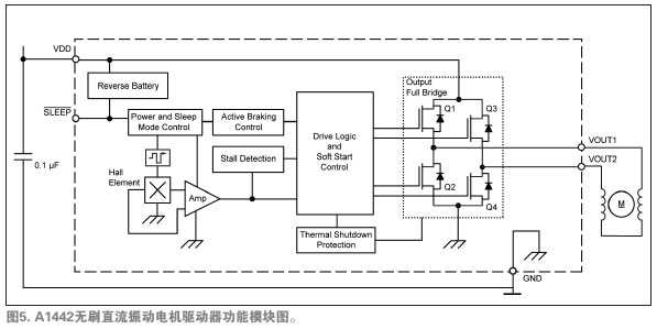 A1442是驅動馬達唯一必須的的IC。圖5所示的功能模塊圖說明了設備運行和先進的特性。注意圖4和圖5中,采用集成的霍爾傳感器免除了外部霍爾傳感器,從而減少了馬達PCB元件數量。唯一所需的外部元件是一種標準電路特性——位于應用馬達安裝PCB上的0.1µF的旁路電容,它用于降低在開關電源的電感負載時產生的瞬時電壓峰值。