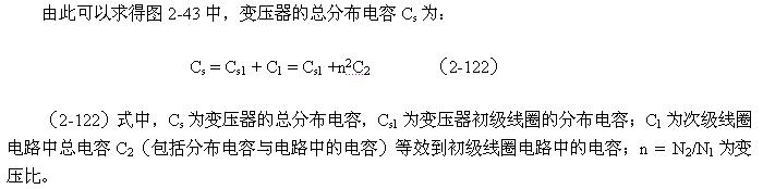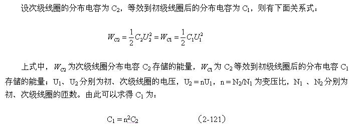 (2-122)式中,Cs為變壓器的總分布電容,Cs1為變壓器初級(jí)線圈的分布電容;C1為次級(jí)線圈電路中總電容C2(包括分布電容與電路中的電容)等效到初級(jí)線圈電路中的電容;n = N2/N1為變壓比。
