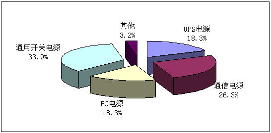 通用開關電源、通信電源、UPS和PC電源是電源領域的主要細分市場。2008年,通用開關電源實現銷售額56.2億元,占據33.9%的市場份額,通信電源市場占26.3%,而UPS市場占18.3%。隨著通信電源、UPS市場的快速增長,其在電源產品整體市場中的份額也在逐步擴大。