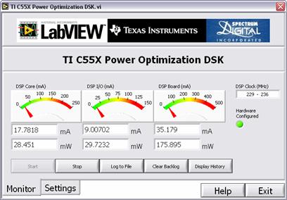 采用LabView和C55電源優化DSK(C55PowerOptimizationDSPStarterKit),設計小組能嘗試采用不同的實施方案,并用類似于圖3所示的GUI工具對功耗加以調節。