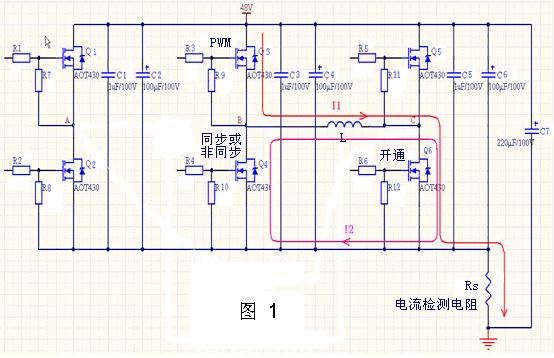 由于無刷電機具有高扭矩、長壽命、低噪聲等優點,已在各領域中得到了廣泛應用,其工作原理也已被大家廣為熟知,這里不再詳述。國內電動車電機控制器通常工作方式為三相六步,功率級原理圖如圖1所示,其中Q1, Q2為A相上管及下管;Q3, Q4為B相上管及下管;Q5, Q6為C相上管及下管。MOSFET全部使用AOT430。 MOSFET工作在兩兩導通方式,導通順序為Q1Q4→Q1Q6→Q3Q6→Q3Q2→Q5Q2→Q5Q4→Q1Q4,控制器的輸出通過調整上橋PWM脈寬實現,PWM頻率一般設置為18KHz以上。