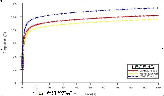 由圖10可知,堵轉時一直導通的下管最熱,溫度已接近150℃。由圖11可知,在堵轉100秒后MOSFET的溫升還未穩定,如果一直堵轉,必將燒壞MOSFET。因此,如果使用仿真中的散熱器尺寸,就不能一直堵轉,必須采取相應的保護措施。我們可以采用間隙保護的方法,即當電機堵轉時,堵轉一段時間,保護一段時間,讓MOSFET的溫度不超過最大結點溫度。圖12所示為堵轉1.5s,保護1.5s的瞬態溫升示意圖,由圖可知,采用這種方法可以有效地保護MOSFET。