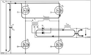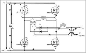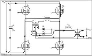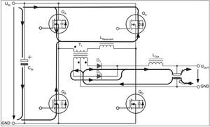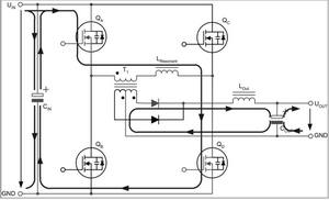 兩個(gè)互為對(duì)角的全橋開(kāi)關(guān)不是同時(shí)驅(qū)動(dòng),而是通過(guò)相移的方法在啟動(dòng)命令之間引入預(yù)定義的短期延遲。這種延遲由控制電路的電壓回路進(jìn)行調(diào)節(jié),從而在兩個(gè)驅(qū)動(dòng)信號(hào)之間產(chǎn)生相移。這種相移技術(shù)的特殊之處在于,它可啟動(dòng)兩個(gè)與變壓器串聯(lián)的開(kāi)關(guān),而變壓器的電壓卻為零。