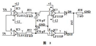 電壓信號VA和電流信號IA經與微電平信號REF比較,取得電壓和電流信號的正半周;經RC濾波后由信號“或”電路,形成含有功率因數角的信號;由單片機去除其中的電壓半周期,即得功率因數角。