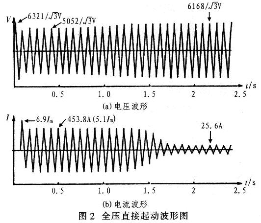 圖2為全壓直接起動的電壓、電流波形。由圖2(a)電壓波形可見,電動機起動前系統電壓為起動中電壓降為即電壓降到起動前電壓的81%(下降19%),電動機起動后經1.9 s到達額定轉速,電壓回升至即原系統的99.3%。由圖2(b)電流波形可見,電動機起動開始時有一個涌流(其第一個脈沖最大,為額定電流Im的6.9倍),很快衰減到453.8 A,為電動機額定電流Im的5.1倍.該電流持續了約1.32 s,然后經0.57 s逐漸下降到電動機的空載電流25.6 A。