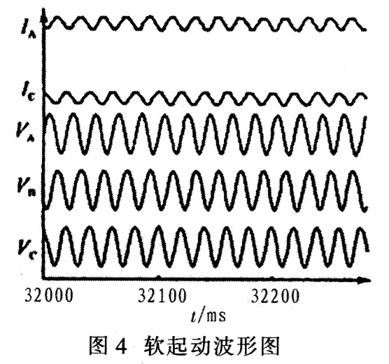 通過對比驗證看出,用軟起動效果遠好于常規起動,雖然在起動過程中,起動電流中含有一定的高次諧波,而電壓中卻只有很小的高次諧波,電壓的總諧波畸變率為2.72%,如見圖4所示,所以并不會對系統造成影響。
