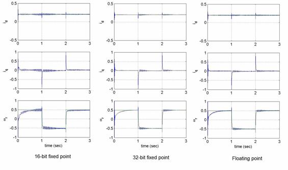 要比較三種數據格式對數值精度的影響,需要監控估計速度響應與相應的d 及q 軸參考電流。將所有的PI 增益、參數、基本量在全部三種數據格式的仿真過程中設定為相同的有效值。從圖4 可以看出,16位定點版本與浮點版本的性能具有極大的差別。