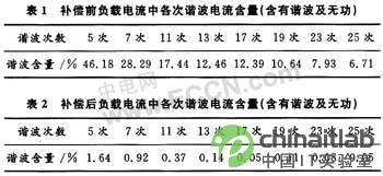 負載電流中含有高次諧波及無功電流時,負載電流總諧波畸變率THD=63.86%,負載電流中各次諧波電流含量見表1;補償后電源電流總諧波畸變率THD=5.35%,電源電流各次諧波電流含量見表2。