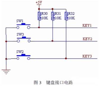 鍵盤接口電路如圖3 所示。鍵盤設計由三個按鍵控制即:“開關”鍵、“+”鍵、“-”鍵, 并外接三個上拉電阻控制鍵盤去抖。此三鍵分別連接到單片機的P1.0、P1.1、P1.2 接口進行控制。