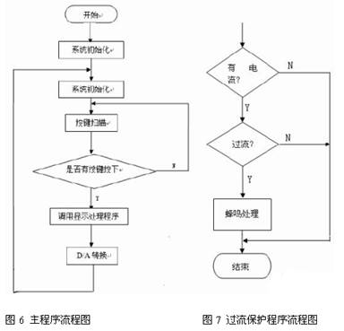 軟件控制程序由主程序和過流保護程序兩部分,其主要實現步進加減、D/A 轉換、鍵盤 掃描、LED 顯示、電流報警等功能。