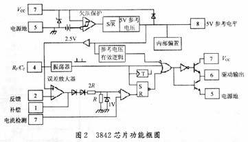 此電源為單芯片集成穩(wěn)壓電源,PWM芯片采用UC3842。UC3842是一種高性能的固定頻率電流型控制器,是專為脫線式直流變換電路設(shè)計(jì)的,其內(nèi)部結(jié)構(gòu)如圖2所示