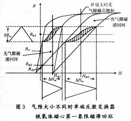 有氣隙時(shí),由于B-H特性曲線斜率減小。在Hdc不變的情況下Bdc減小,磁滯回環(huán)遠(yuǎn)離飽和區(qū)。另外,有氣隙時(shí)剩余磁感應(yīng)強(qiáng)度Br減小,ΔBac變化范圍增大。另外又由于有氣隙時(shí)B-H特性曲線向H軸靠攏,在ΔBac,Bdc不變的情況下ΔHac,Hdc增大。由上可知,適當(dāng)增加氣隙可以增強(qiáng)電路的電流輸出能力和抗干擾能力。
