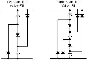 業(yè)界有關(guān)無(wú)源(Passive)功率因數(shù)校正(PFC)的方案眾多,這些方案通常都使用較多的額外元器件,其中的一種方案就是谷底填谷(valley-fill)整流器,其中采用的電解電容和二極管組合增大了線(xiàn)路頻率導(dǎo)通角,從而改善功率因數(shù)。實(shí)際上,這個(gè)過(guò)程利用高線(xiàn)路電壓以低電流給串聯(lián)電容充電,然后在較低電壓時(shí)以較大電流讓電容放電給開(kāi)關(guān)穩(wěn)壓器。典型應(yīng)用使用2個(gè)電容和3個(gè)二極管,而要進(jìn)一步增強(qiáng)功率因數(shù)性能,則使用3顆電容和6個(gè)二極管。