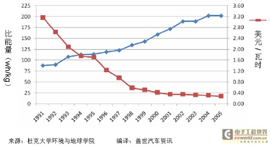隨著全球尤其亞洲地區(qū)(以日本為主)的傳統(tǒng)或非傳統(tǒng)的電池企業(yè)都紛紛加大對(duì)車用鋰電池的投資,并增加量產(chǎn)規(guī)模,鋰電池的價(jià)格已經(jīng)呈逐年下降趨勢(shì)。(見圖1)