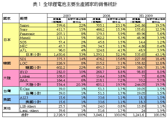 如以國家區分, 2007年到2009年上半年的全球鋰電池芯產業市場佔有率分析,主導國家為日本, 2008年以前日本的全球市場佔有率達50%以上,其次為韓國的23%及中國大陸的20%(不含ATL),但2009年上半年有明顯變化,韓國廠商的全球市場佔有率提升至31%,日本廠商(含ATL)則下滑至43%,韓國與日本的差距拉近之中,中國大陸則維持20%的市場佔有率,至于臺灣部份,則持續維持約1.5~2%的全球市場佔有率。