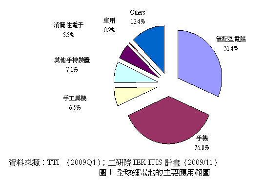 根據IIT的銷售統計,全球鋰電池芯的44%用在手機及手持裝置、31.4%用在筆記型電腦及5.5%用在其他消費產品,此三種應用已涵蓋80%的鋰電池芯需求,主要應用統計如圖1。