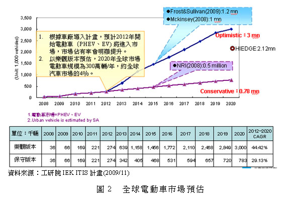 近年來,因應氣候變遷及降低石油依賴等考量因素,全球各主要國家積極發展低污染與低(零)油耗的電動車,促成鋰電池產業在原有應用領域之外的新需求。根據各國的補助政策及車廠推出的電動車計畫,預計電動車將在2012年開始進入小規模量產,同時,以較樂觀的成長率推估,預期在2020年可達到年銷售量300萬量的規模,未來市場預估如圖2。