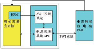 自適應(yīng)電壓調(diào)整AVS基于跟蹤系統(tǒng)處理器的性能變化,由嵌入式自適應(yīng)先進(jìn)電源控制器(APC)做出自適應(yīng)電壓調(diào)整。APC通過PowerWise接口將系統(tǒng)處理器的性能(頻率)、溫度變化準(zhǔn)確地傳遞給外部自適應(yīng)電源管理芯片。然后,該電源管理單元根據(jù)性能需求自動調(diào)整供給系統(tǒng)處理器的電壓,使處理器運(yùn)行在能確保應(yīng)用軟件正確運(yùn)行的最低電壓和頻率下。DVS和AVS的核心是先進(jìn)電源控制器(APC)。圖2為AVS的原理框圖。