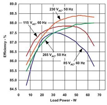 總之,更嚴(yán)格的節(jié)能標(biāo)準(zhǔn)要求創(chuàng)新的電源技術(shù),電源需要在整個負(fù)載范圍內(nèi)都有很高的效率,并可極大節(jié)約能源。基于負(fù)載條件,操作不同模式下的使用準(zhǔn)諧振控制和跳脈沖技術(shù)的反激式變換器可闡明它對AC/DC應(yīng)用中的節(jié)能進(jìn)行優(yōu)化的有效性。新開發(fā)的IC(如TI推出的UCC28600)是符合新節(jié)能標(biāo)準(zhǔn)的最優(yōu)解決方案之一。圖3提供了效率的典型測試結(jié)果,而圖4則顯示了在連接于通用離線輸入(帶單一18Vdc輸出)的65W反激式變換器中使用UCC28600的準(zhǔn)諧振控制和跳脈沖技術(shù)的待機(jī)功率。