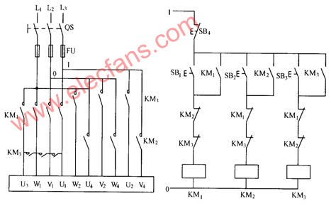 顯然,這套線路任何一種速度要轉換到另一種速度時,必須先按下停止按鈕,因為三個接觸器之間是電氣互鎖的。