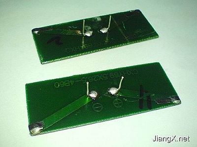 首先剪一小段金屬絲焊接在太陽能電池板的兩個電極上作為引腳(圖3),以便于連接和固定在電路板上。兩塊太陽能電池板是正極對正極,負極對負極(上面有標識)并聯起來使用的,這樣可以有效地增強太陽能電池板提供電流的能力。安裝好太陽能電池板后如圖4所示。