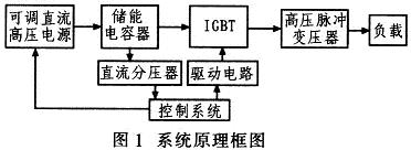 系統工作過程如下:由控制系統控制可調直流高壓電源給儲能電容器充電,當充電電壓達到設定值后,再控制IGBT按照設定的頻率和脈沖寬度導通,產生脈沖電壓加在高壓脈沖變壓器原邊,最后由高壓脈沖變壓器升壓,產生所需的高壓脈沖加在負載上。