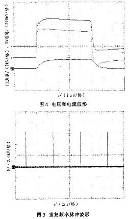圖4中,縱坐標為電壓幅度值(2通道2kV/格,4通道200mV/格)。通道2為電壓波形,電壓約為5kV,脈沖寬度為10μs,上升沿小于lμs。通道4為電流波形,電流值約85A(波形圖中比例為l:500)。圖5中,脈沖周期為5ms,重復頻率為200Hz。圖6中,縱坐標為電壓幅度值(1通道5kV/格,2通道2V/格)。l通道為放電電壓波形,2通道為放電電流波形。從波形圖中可以看出,脈沖當電壓加在氣體上時,大約經過幾微秒時間后,氣體發生電離。此時由于分壓原因,電壓幅值略有下降,電流波形開始出現。在脈沖電壓加載期間,氣體維持了電離狀態。