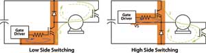 在圖1中,電壓源變頻器的臨界電流路徑被標為紅色陰影,其特征是di/dt變化率高,這個特征也表現在對應的柵極驅動電路上。要保證柵極驅動電路安全的工作,就要最大限度地減小雜散電感。尤其是高壓側柵極驅動電路,存在一個由低壓側二極管和電流通道上的阻性和感性壓降所引起的,且幅度超過VS最小允許電壓的負壓,會導致電路工作異常。