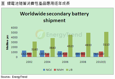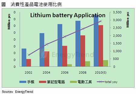 鋰電池出貨隨消費(fèi)性應(yīng)用增加逐年成長(zhǎng)