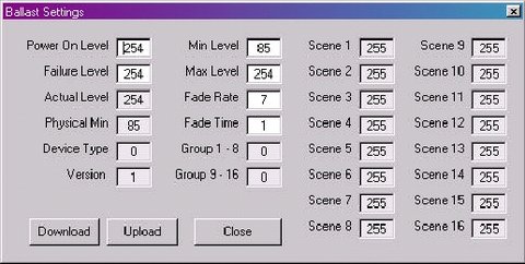 當程序第一次加載時,“電子鎮(zhèn)流器設置(Ballastsetting)”窗口將沒有數據顯示,要完成一只實際電子鎮(zhèn)流器的設置,應在主界面設置適應的地址,并按下“電子鎮(zhèn)流器設置(Ballastsetting)”窗口中的“Down/Load”按鈕。
