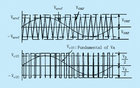 為產(chǎn)生任意波形的交流電壓,將PWM技術(shù)應(yīng)用到直流母線電壓斬波的電壓源逆變器上。現(xiàn)有很多能組成正弦波或任意波形的PWM技術(shù),利用PWM技術(shù),不僅允許控制逆變器作為電壓源,也可作為電流源以控制濾波器的交流輸出。圖2為所利用的最普通的三角載波(TC)技術(shù),這是最簡單的線性控制方法,是將有固定幅值的和固定三角波的輸出電流誤差進(jìn)行比較。迫使開關(guān)周期內(nèi)的輸出電壓Va限定于Vcar的載波周期內(nèi),并等于調(diào)制波Varef的平均幅值。正弦調(diào)制波的合成電壓含正弦基波分量Va(f)和不希望的諧波分量,利用盡可能高的頻率載波,可使這些不想要的諧波成分減到最小,但這取決于半導(dǎo)體功率器件(IGBT、GTO或IGCT)的最大開關(guān)頻率。