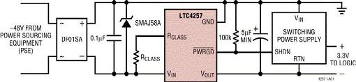 圖1b:采用LTC4257實現的符合基本802.3af標準的PD電路。