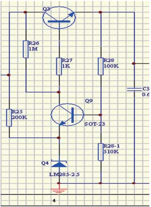 因為S-8251芯片輸入電壓范圍是2.5~16V,總線輸入電壓范圍24V,必須先經過降壓環節,這將使變換效率大打折扣。降壓電路靜態功耗要小于幾十μA量級,否則總線電流很難做到小于3.5mA。我采用MOSFET串聯降壓方式,基準源沒有采用穩壓二極管,而是使用LM385,做到靜態電流36μA。圖3為24V降壓到16V電路。