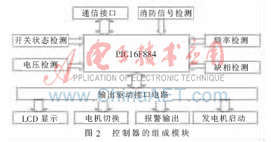 智能型雙電源開關(guān)控制器以單片機PIC16F884為核心,對兩路供電電源(常用電源和備用電源)的電壓、頻率和相位進行實時檢測。當其中一路電源(常用電源或備用電源)的電壓發(fā)生過壓、欠壓或是缺相時,控制器就會發(fā)出電機切換命令,使供電電源自動切換到另一路電源(備用電源或常用電源)上,以此來保障供電的連續(xù)性??刂破鞯墓ぷ鞣绞街饕凶詣臃绞胶褪謩臃绞絻煞N??刂破鞯慕Y(jié)構(gòu)框圖如圖1所示,組成模塊如圖2所示。