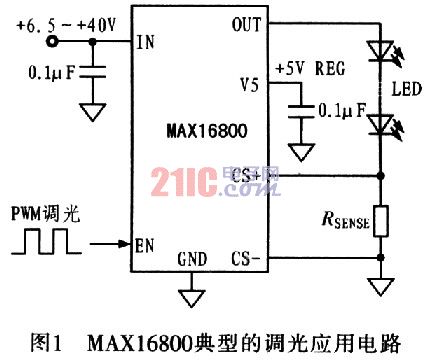 圖1為MAXl6800典型的調(diào)光應(yīng)用電路。MAXl6800具有高輸入電壓范圍(達(dá)40V),可直接連接到汽車電池而不需要保護(hù)器件,保護(hù)器件一般用來(lái)抵御電池負(fù)載變化帶來(lái)的浪涌電壓。MAxl6800能夠?yàn)長(zhǎng)ED提供恒定電流,電流值可以通過(guò)與LED串聯(lián)的檢流電阻RSENSE設(shè)置。為了提高電流設(shè)置精度,提高對(duì)外部噪聲的抑制能力,MAXl6800采用差分電流檢測(cè)輸入方式。