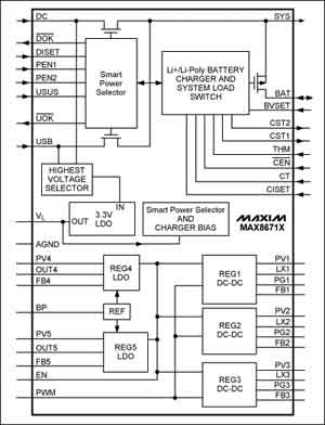 任何便攜電子系統(tǒng)都要求低成本、小尺寸、輕便。而為板上子系統(tǒng)設計電池充電及供電電路時,用電源管理IC可以方便地實現(xiàn)上述功能。這類的器件有很多,比如Maxim公司的MAX8671X,其可以從USB口或外部交流適配器獲取電源,為鋰離子或鋰聚合物電池充電。除了充電功能外,該器件內(nèi)部還集成了用于USB和直流輸入的過壓保護開關,5路獨立的片上穩(wěn)壓器,這一組合大大減少了電路板的外部元件數(shù)量。