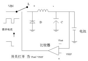 快速調(diào)節(jié)器的操作是通過控制一個(gè)晶體管開關(guān)的占空比來實(shí)現(xiàn)的。占空比會(huì)自動(dòng)增加以使電池流入更多的電流。當(dāng)VBATT<VREF時(shí),一個(gè)比較器會(huì)將開關(guān)閉合(參見圖5a),電流流入電池和電容C,這個(gè)電流同時(shí)也存儲(chǔ)在電感L中。VBATT持續(xù)升高,直到超過VREF,調(diào)節(jié)此時(shí)比較器將開關(guān)斷開(參見圖5b),存儲(chǔ)在電感中的電流迅速下降直到二極管偏置,使得電感電流以減速度流入電池,電容C在電感電流衰減后開始放電。并且最后VBATT開始下降,當(dāng)VBATT低于VREF時(shí),比較器再次將開關(guān)閉合并開始另一次循環(huán)。在較大的范圍內(nèi)如果減小占空縮短閉合的時(shí)間,平均電壓就會(huì)下降,反之亦然。因此可以通過控制占空比的方法調(diào)節(jié)電壓或電流至所需要的值。