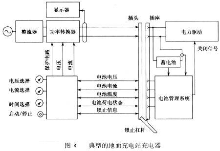 圖3為一典型的地面充電站中充電器的方案,該充電器由一個能將輸人的交流電轉換為直流電的整流器和一個能調節直流電功率的功率轉換器組成,通過把帶電線的插頭插入電動汽車上配套的插座中,直流電能就輸入蓄電池對其充電。充電器設置了一個鎖止杠桿以利于插入和取出插頭,同時杠桿還能提供一個確定已經鎖緊的信號以確保安全。根據充電器和車上電池管理系統相互之間的通訊,功率轉換器能在線調節直流充電功率,而且充電器能顯示充電電壓、充電電流、充電量和充電費用等。