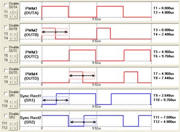 因此,為最大限度地提高效率,要求死區時間盡可能小。但是在傳統的模擬方案中,自驅動型除了應用的限制外,還很難提供精確的控制時序;對于外驅動型,由于其參數是由電阻、電容等無源器件進行設定,存在誤差、老化、溫漂等問題,為保證有足夠的余量,死區時間也不可能設置得很小。因此,ADP1043的數字方案是很好的選擇。圖2所示為ADP1043在全橋拓撲電路下的PWM和SR的GUI設置界面。通過設置T9、T10、T11和T125便可精確獲得同步整流MOSFET所需的死區時間,其中每次調整的最小時間為5ns。