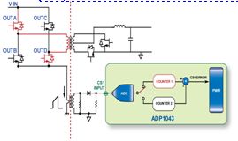 在傳統的橋式拓撲電路中,一般為防止變壓器的偏磁,會在變壓器的原邊回路中串入一個隔直電容器。這樣做存在缺點,一方面是增加了電源的成本和體積,另一方面又增加了損耗,降低了效率。ADP1043采用伏秒平衡控制的數字技術解決了該問題。如圖3所示,在每個開關周期中,ADP1043通過CS1分別測量流過開關管A、D和開關管B、C的電流并計算其差值,通過差值信號調節驅動信號OUTB和OUTD的脈寬,對失衡進行補償。