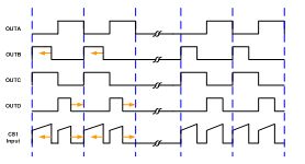 例如,如圖4所示,當CS1測量到流過開關管B、C的電流大于開關管A、D時,便會減小OUTB的脈寬,增大OUTD的脈寬,這樣流過開關管B、C的電流會減小,而流過開關管A、D的電流會增大,經過若干周期后,電流自動實現了平衡。采用該技術后,可有效防止偏磁,并且省去隔直電容器,提高效率和可靠性。