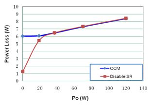 通過ADP1043的GUI可以設置關閉同步整流時的電流閾值。當輸出電流值低于該閾值時,關閉同步整流。如圖6所示為采用ADP1043設計的全橋拓撲的模塊電源在不關閉和關閉同步整流在輕載條件下的損耗的情況。可以看到,當關閉同步整流后,大大減少了電源的輕載損耗。