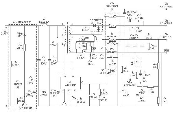 該電源以5V輸出作為主輸出,其他兩路輸出都是在此基礎(chǔ)上獲得的。由C11,R11,R12和MOS場效應(yīng)管V2及V1構(gòu)成5V主輸出的電容耦合式同步整流器。穩(wěn)壓管VDZ3起箝位作用。在沒有開關(guān)信號時,通過下拉電阻R13使V2關(guān)斷。儲能電感L2回掃繞組的電壓經(jīng)過VD4和C9整流濾波后,獲得20V輸出。高頻變壓器次級繞組(8-5)的電壓經(jīng)過VD3和C10整流濾波后獲得7.5V輸出。將6.8V穩(wěn)壓管VDZ4和二極管VD7反極性串聯(lián)后作為7.5V輸出的負(fù)載電阻,以改善空載穩(wěn)壓特性。空載時輸出電壓一旦超過7.5V,VDZ4就被反向擊穿,利用VDZ4和VD2上的壓降可將輸出電壓箝制在大約7.5V上。正常工作時,輔助繞組的輸出電壓經(jīng)過VD6、C5整流濾波后給光耦合器PC357提供12~15V的偏壓。R5、VD8和C16組成軟啟動電路,能防止在啟動過程中輸出過沖。