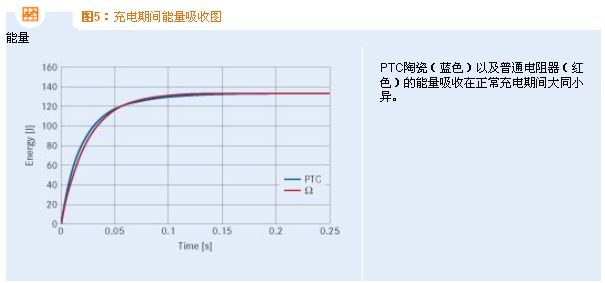 在短時間內(nèi),并聯(lián)的兩個自我防護(hù)式充電電阻器與外界達(dá)到熱平衡,同時由于PTC陶瓷的高電阻值,吸收的能量僅有略微上升。最終產(chǎn)生的能量吸收與圖7所示類似。