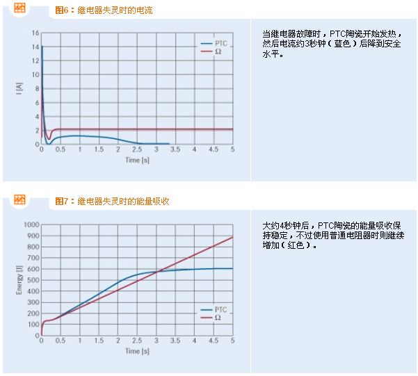 當(dāng)發(fā)生故障時,PTC熱敏電阻用作限流元件的優(yōu)勢就會十分明顯。如果繼電器接通失敗,負(fù)荷電流將流經(jīng)充電電阻器,并產(chǎn)生強(qiáng)大的熱應(yīng)力,這要求電阻器有相應(yīng)的尺寸。若采用基于PTC陶瓷的充電電阻器,其電阻會由于強(qiáng)大的起始功率損耗而升至數(shù)10 k,從而能夠在故障發(fā)生期間限定電流(參見圖6)。在約三秒之后,先流經(jīng)兩電阻器然后流經(jīng)總體電路的電流已跌至數(shù)10 mA。有關(guān)吸取能量的比較,請參見圖7。