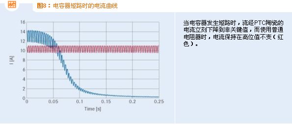 在這兩種情況下,充電電流的時間曲線幾乎相同。PTC陶瓷與固定電阻在電流特性方面的細(xì)微差別的產(chǎn)生原因是: