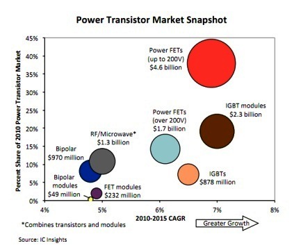 根據IC Insight的預測,整體功率電晶體市場營收將在2010至2015年間,取得6.4%的復合年平均成長率(CAGR),在2015年達到163億美元規模;同時期低電壓(200V以下)功率FET市場CAGR為6.7%,到2015年營收規模可達164億美元。
