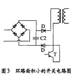 如圖2為環(huán)路面積較大的開(kāi)關(guān)電路,圖3為環(huán)路面積較小的開(kāi)關(guān)電路。