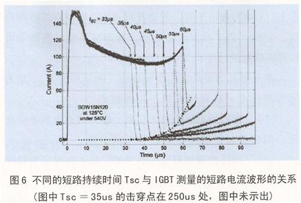 圖6給出不同短路續(xù)時(shí)間TSC,IGBT測(cè)量的短路電流波形。